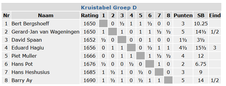 Bert Bergshoeff, een groep hoger in D, beweerde (het glas is half vol) de middenkampioen te zijn. Zie tabel. Met 3 punten eindigde hij inderdaad in de middenmoot.