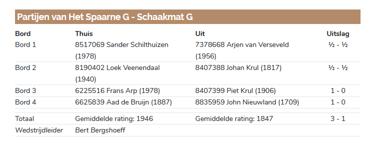 Door deze nipte zege staat Spaarne 1 zelfs bovenaan in klasse 4D. Hopelijk gaat er nu niemand uitgebreid filosoferen over een kampioenschap, of promotie naar de derde klasse. Van uw verslaggever hoeft dat niet, ofschoon gezonde ambitie in het schaken mij niet vreemd is. De sterkste teams moeten we nog ontmoeten. Voor degradatie hoeven we met zeven matchpunten in ieder geval niet bang te zijn. Voorlopig zitten we riant op het pluche. Het pluche van de niet-degradant.
