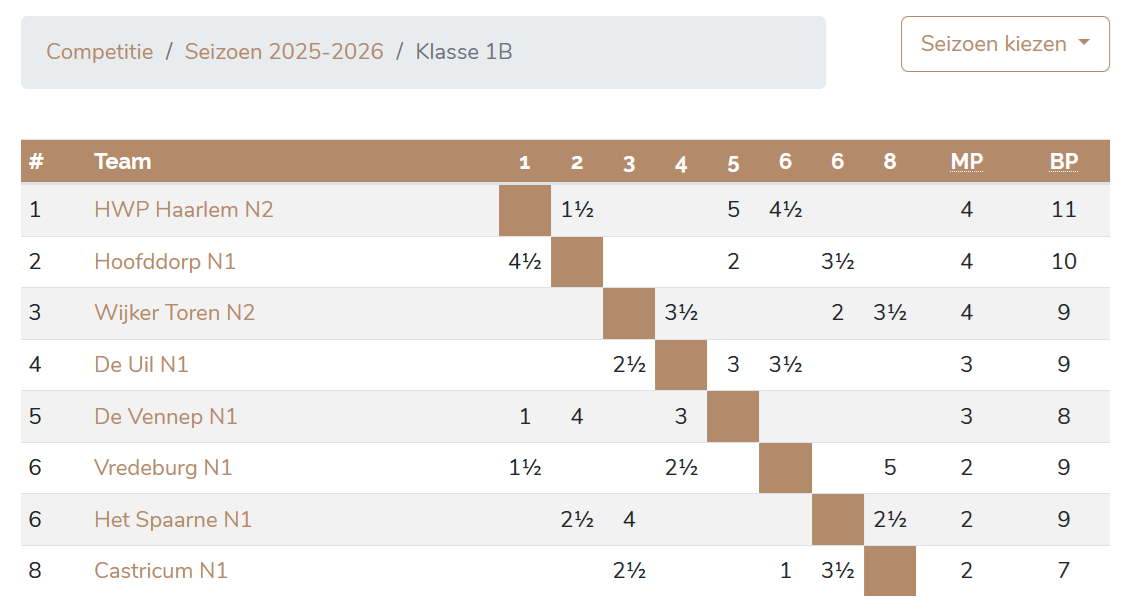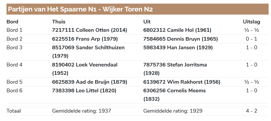 Het bezoekende team Wijker Toren N2 kwam in een redelijk sterke opstelling en toen Loek Veenendaal aan zijn bord schoof waren wij ook compleet. Frans Arp op bord 2 verloor in een op het oog kansrijke positie. Hij sloot ten onrechte de koningsvleugel om met een binnenvallende dame gevaarlijk te worden. De zwarte verdediging van Dennis Bruyn met Pf8 klopte echter en wit bleef materiaal achter.