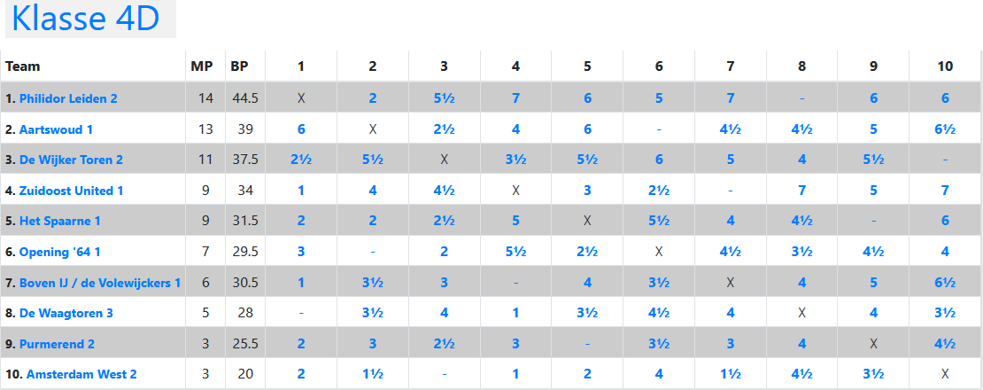 Keimpe Knijft op 8 verloor. Hij speelde onnauwkeurig in een remisestelling tegen een sterke tegenstander en dat gaat op dit niveau niet was zijn commentaar. Ook Yashin van Kesteren had het liever niet meer over zijn verliespartij op bord 5. Pijnlijk slecht noemde hij het geloof ik. Ik zag Frans Arp op bord 6 nog een matdreiging met twee torens uit de hoge hoed toveren, maar de promotie van een witte pion was te veel. Leo Littel speelde remise op 7 en dan komen we bij de laatste partij die nog aan de gang was : Paul tegen Paul op bord 4 en dat werd remise, we bedoelen hier natuurlijk Paul Ruber, en het werd na hevige strijd inderdaad remise. Bij de 34e zet van zwart heb ik als verslaggever een variant toegevoegd bij het commentaar van Sander, omdat het een soort zet is waar ik van houd. Dubbelaanval: stuk en lijn of veld, zoiets zal het wel genoemd worden in de methode Brunia/Van Wijgerden.