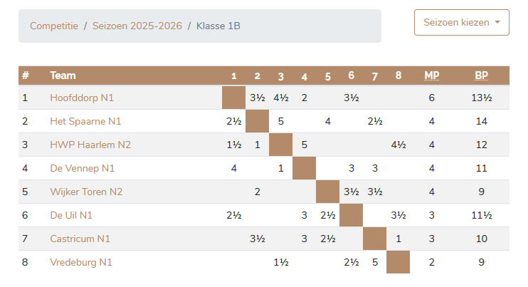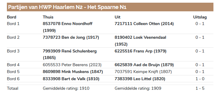 HWP, de club die de successen van het Eerste, Tweede en Derde KNSB-team van vorig seizoen, in een prachtig vormgegeven jaarboek, breed uitmeet, kwam er met hun N2-team wonderlijk genoeg weer niet aan te pas. Vorige keer was de overwinning nog ruimer met 5½ punt in de mooiste schaaklocatie van Haarlem. Op basis van de rating zou je eerder uitslagen in de buurt van 3-3 verwachten. Ze moeten daar wel een hekel aan ons krijgen. Jammer dat Leo Littel verloor, ik zag hem met weinig tijd op de klok tegen Bart de Valk. Van de eerste borden heb ik weinig gezien, behalve de koningen die verschenen op het midden van het bord aan het eind van de partij en dan allemaal aan de goede kant. Naast mij was Frans Arp aan het matzetten zag ik nog wel.